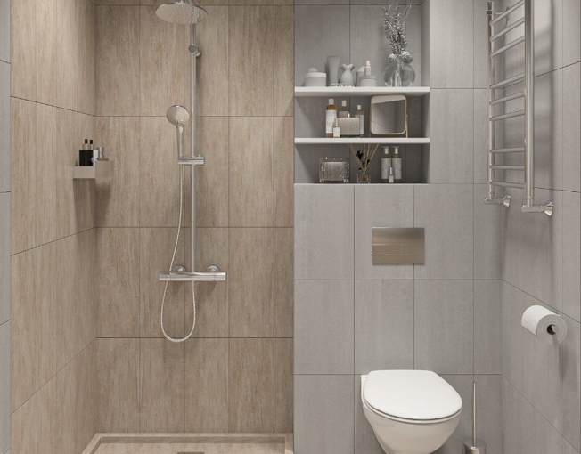 - Полная отделка санузла: плитка, инсталляция с унитазом, смеситель для душа.